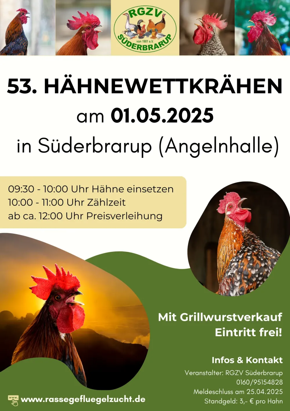 Am 01. Mai 2025 findet das traditionelle Hähnewettkrähen in der Angelnhalle in Süderbrarup statt! Seien Sie dabei, wenn stolze Hähne um die Wette krähen und die besten unter ihnen prämiert werden.